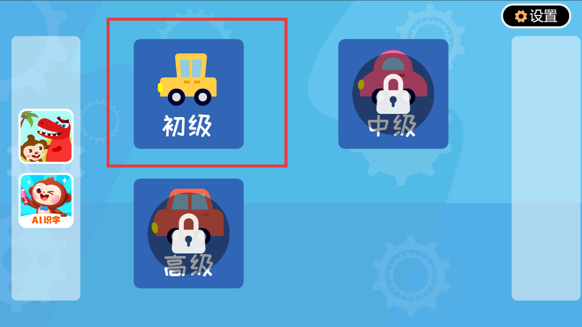 1、難度選擇頁,設初、中、高三個等級,僅初級可解鎖,其余需逐步開啟,左側有AI識字等入口,適配兒童認知進階需求。