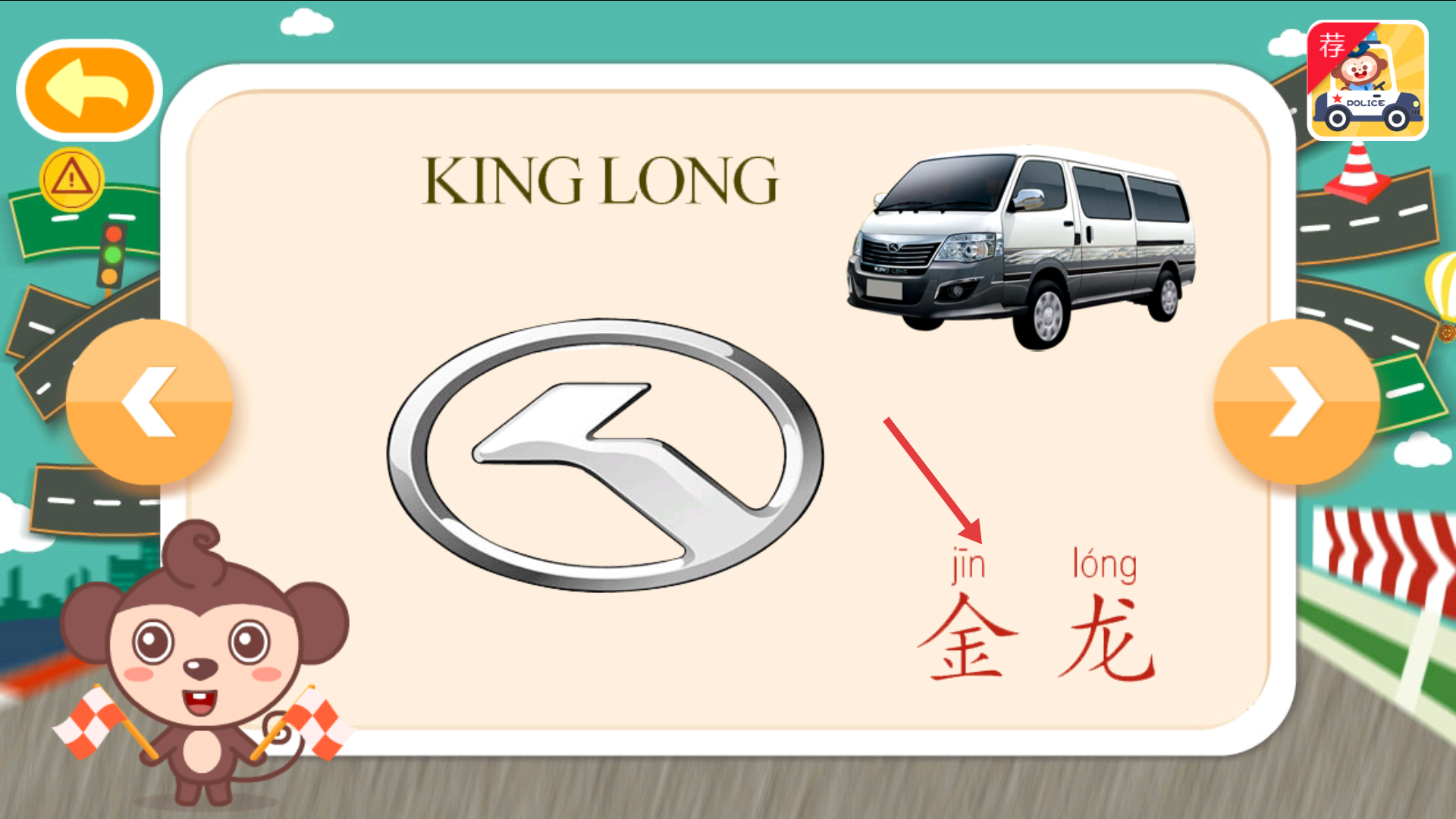 3、車標學習頁,展示金龍車標,配套品牌名、車型圖及拼音標注,通過圖文結合方式幫助兒童直觀認知對應品牌與車型。
