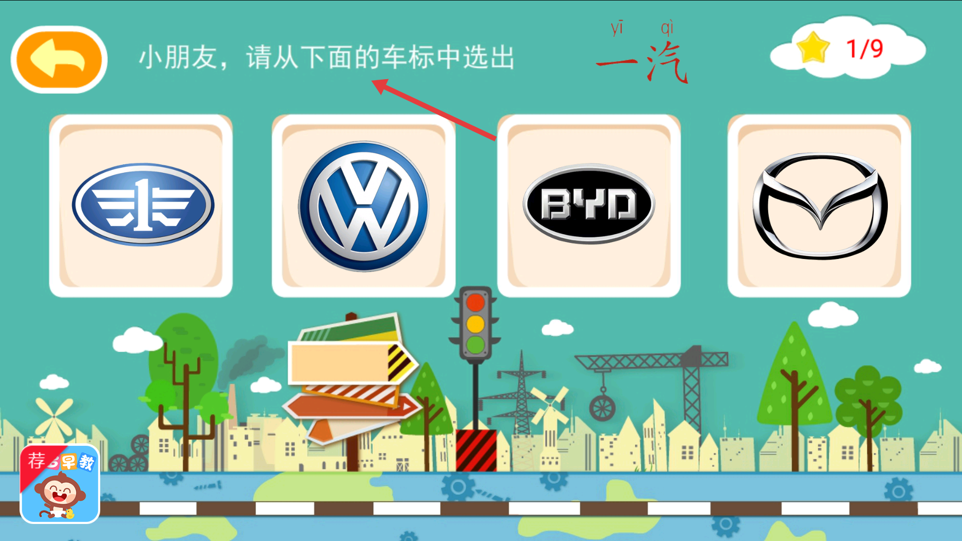 4、選擇測試頁,以選出一汽車標為任務,展示多個車標選項,借選擇題檢驗認知效果,同時標注進度增強學習的目標感。