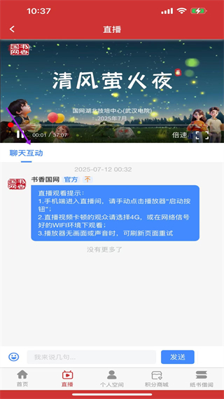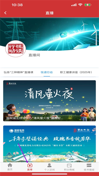 3、點擊底部直播入口,進入直播間頁面,可看弘揚精神直播課等活動,如清風螢火夜等主題內容,支持查看詳情。