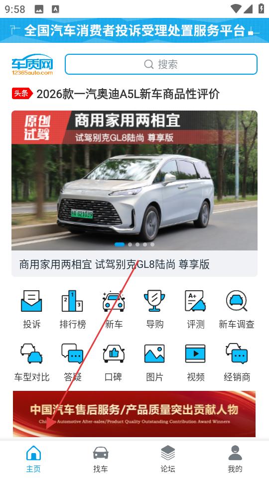 1、打開車質網APP,進入主頁,可看到投訴、排行榜等功能入口,若想篩選車輛,點擊找車,進入篩選頁面。