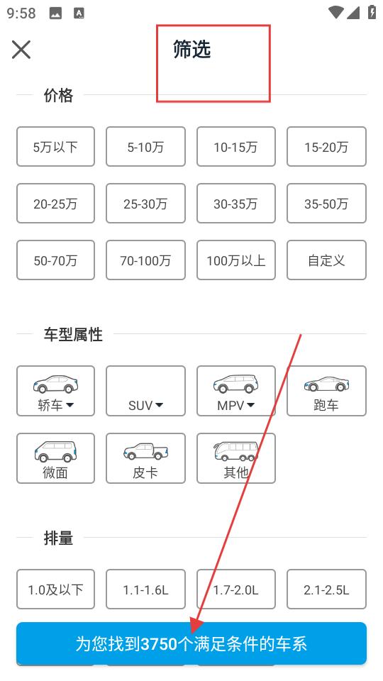 2、在篩選頁,選擇價格區間、車型屬性、排量等條件,點擊下方按鈕,獲取滿足條件的車系列表。
