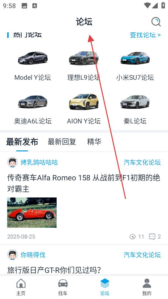 3、返回主頁,點擊論壇,進入論壇界面,瀏覽熱門論壇與最新發布內容,參與汽車相關話題討論。