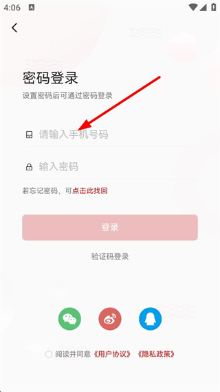 4、若選擇密碼登錄,界面輸入手機號碼及設置的密碼,確認信息無誤后點擊登錄,也可切換至驗證碼登錄方式。