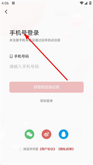 3、選擇手機號登錄時,對應界面輸入手機號碼,獲取并填寫短信驗證碼,勾選協議后即可完成登錄操作。