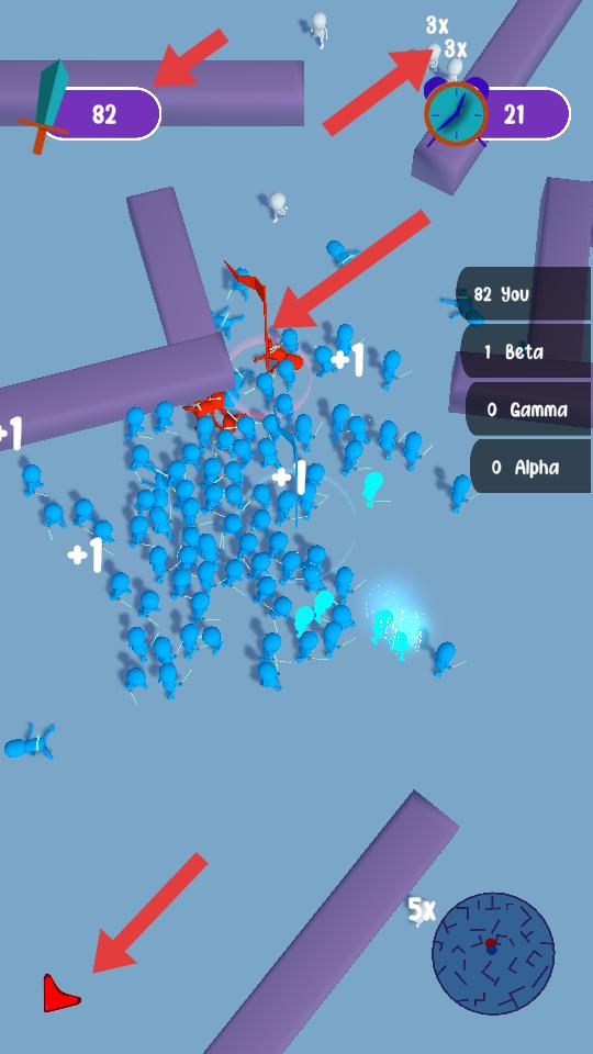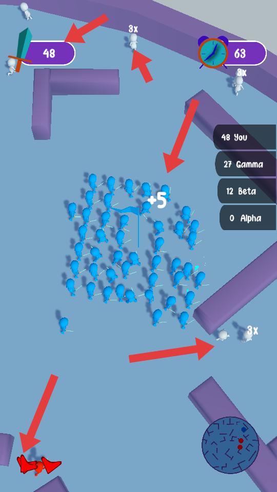 2、在迷宮里,讓藍色角色聚集同伴壯大隊伍,留意界面顯示的數值與對手,避開紅色敵人,同時爭取數量優勢。
