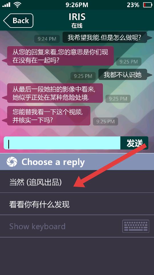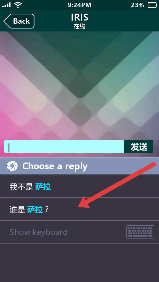 3、當出現選擇回復選項時,根據對話情境,選擇合適的回復,比如點擊誰是薩拉,推進與IRIS的對話進程。