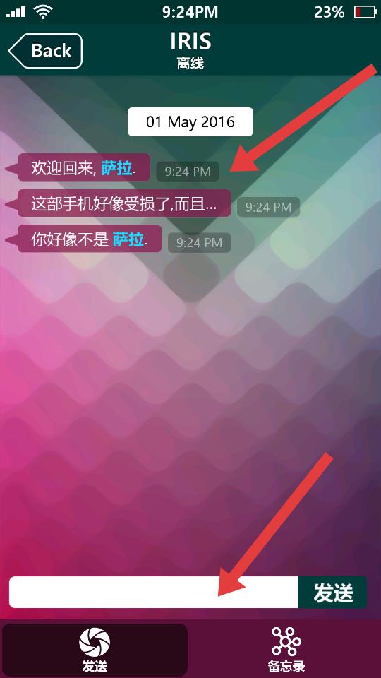 2、進入與IRIS的聊天界面,查看已有的對話內容,在下方輸入框中輸入想要回復的文字,之后點擊發送,與IRIS進行交流。