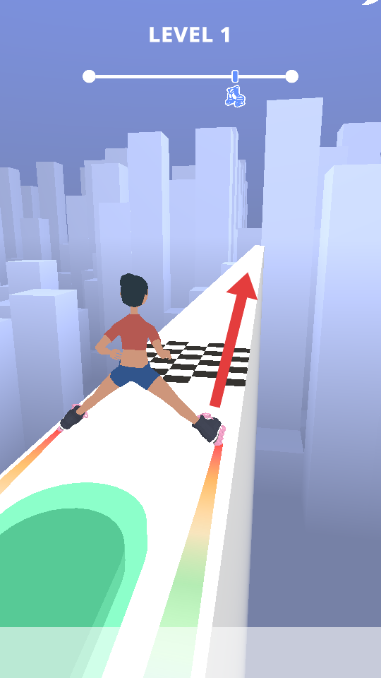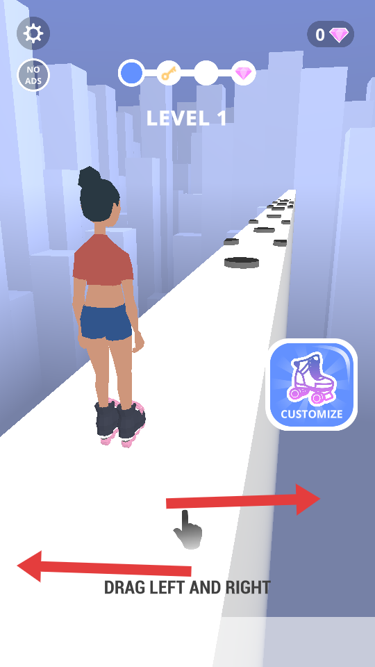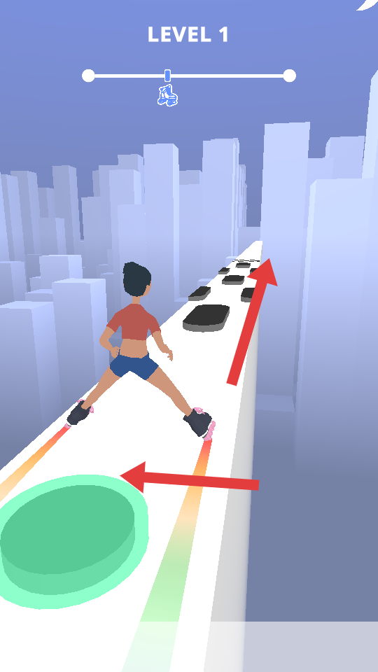 1、在關卡1開始界面,根據提示,通過左右拖動屏幕,控制角色在輪滑軌道上移動,躲避障礙物。