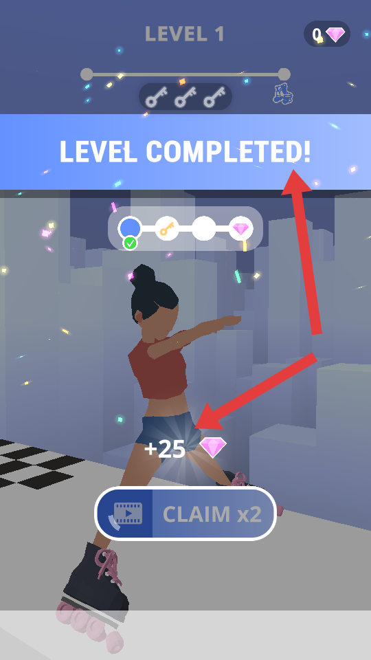 4、成功到達終點后,界面顯示通過此關,可獲得25鉆石等獎勵,點擊相關按鈕可領取獎勵,結束本關卡。