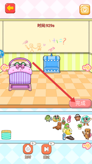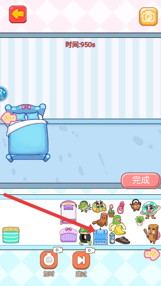 4、持續從下方選取物品布置房間,像放置可愛玩偶、擺上特色小家具等,讓房間各區域都有精心布置的元素,布置好可以點擊完成。