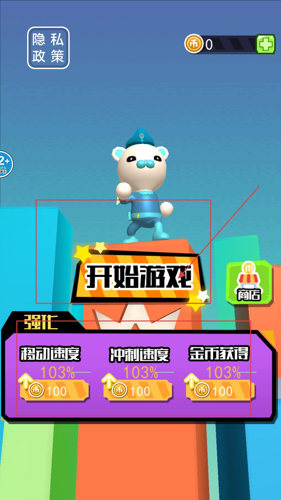 1、在游戲初始界面,可花費100金幣強化移動速度、沖刺速度、金幣獲得,強化后各屬性提升,然后點擊【開始游戲】進入。