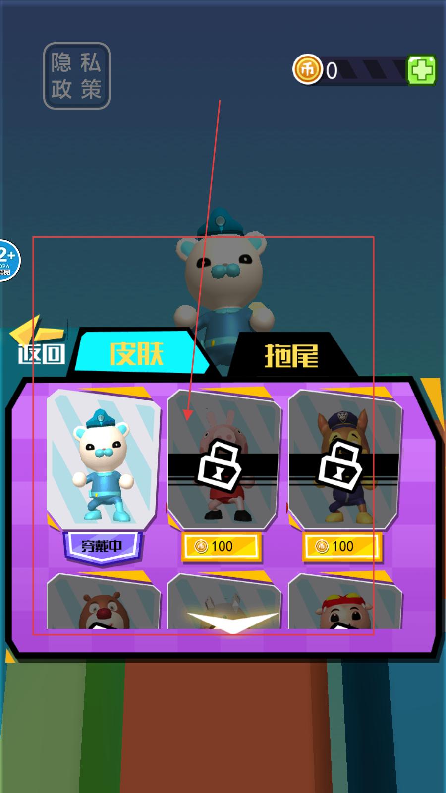 2、玩家還可在皮膚界面,有多種角色皮膚可選,部分皮膚需花費100金幣解鎖,當前默認穿戴的是藍色服飾的小熊皮膚。