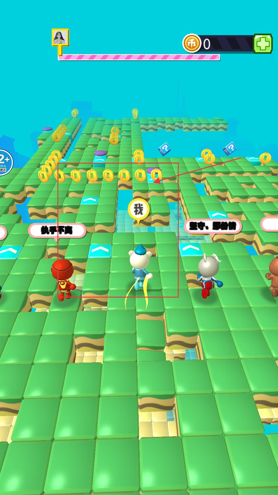 3、進入游戲后,玩家要操控角色在綠色方塊組成的場景中移動,收集金幣,同時注意避開危險區域,與其他玩家角色競爭。