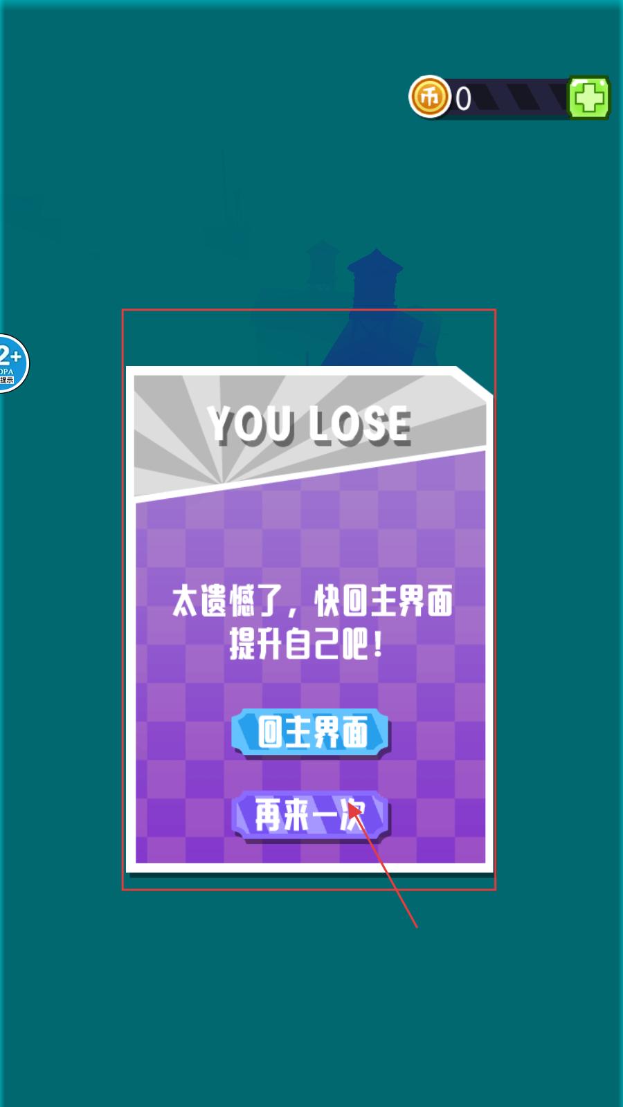 4、若游戲失敗,會出現失敗的提示,玩家可以選擇【回主界面】提升自己后再玩,或點擊【再來一次】重新挑戰。
