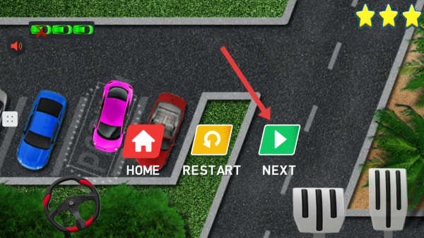 4、成功停車后,會出現包含HOME、RESTART、NEXT等選項的界面,可選擇進入下一關繼續停車挑戰。