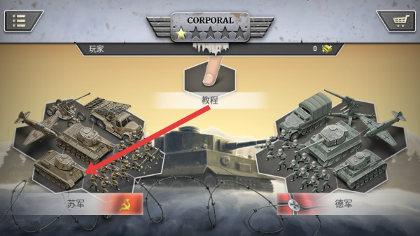 2、戰役模式界面,可選擇蘇軍陣營,還有教程等選項,點擊相關區域,進入戰斗準備環節。