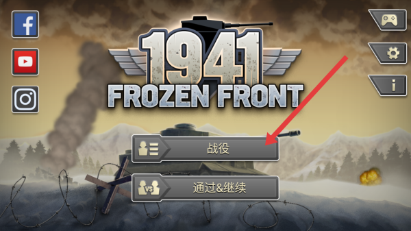 1、進入游戲,能看到帶有1941FROZENFRONT字樣的界面,有戰役和通過繼續兩個選項,點擊戰役,進入戰役模式選擇界面。