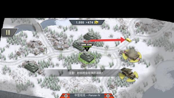 4、戰斗過程中,使用坦克等單位攻擊敵軍,屏幕提示注意,射擊時會有彈藥消耗,合理利用彈藥,推進戰斗進程。
