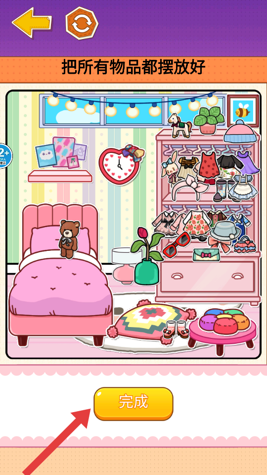 3、當所有物品都按要求擺放完畢后,界面下方會出現完成按鈕,點擊該按鈕,提交布置結果,等待通關判定。