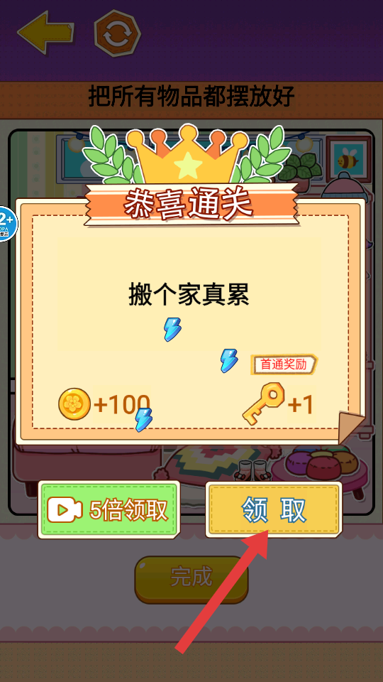 4、成功通關后,界面顯示恭喜通關,還有搬個家真累的文字,以及金幣等獎勵,點擊領取按鈕,獲取通關獎勵。