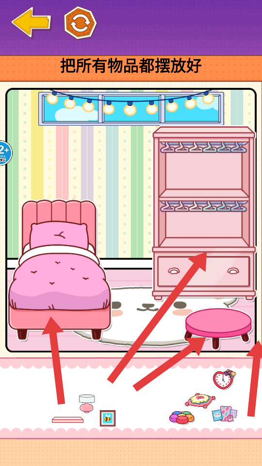 2、進入游戲后,界面提示把所有物品都擺放好,需將下方的各類物品,如床、小凳子、衣柜等,移動到房間內合適的位置。