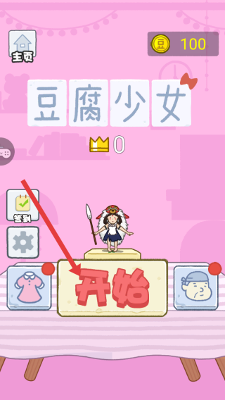 1、進入游戲,能看到帶有豆腐少女字樣的界面,有開始等按鈕,點擊開始,進入技能選擇環節。