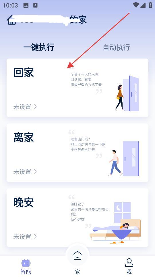 3、家頁面,提供回家、離家、晚安等一鍵執行場景,用戶可根據需求設置相關智能操作。