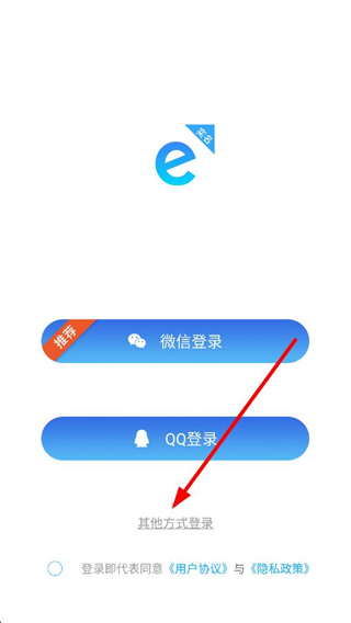 1、進入e的登錄界面,可選擇微信登錄QQ登錄這兩種常用方式,也能點擊其他方式登錄,同時需勾選用戶協議與隱私政策,才能推進后續的登錄流程。
