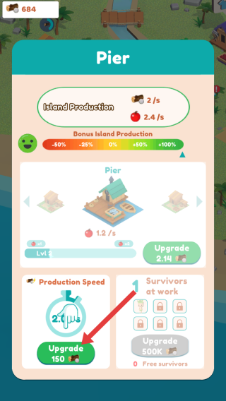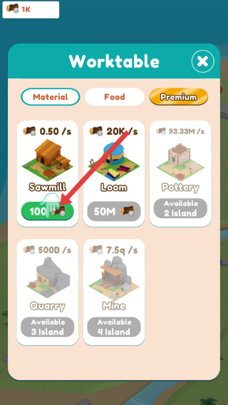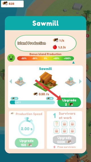3、對于已建造的設施,如鋸木廠,可點擊按鈕進行升級,升級后能提高資源生產速度,讓島嶼生產更高效。