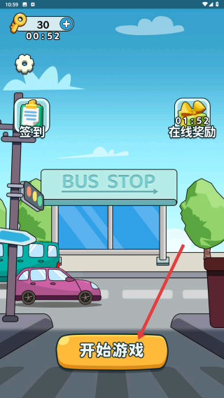 1、進入游戲,看到有簽到、在線獎勵等功能按鈕,點擊開始游戲,進入模式選擇界面,準備開啟停車挑戰。