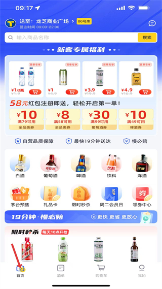 1、首頁,有新客專屬福利、多品類商品入口、限時秒殺,還標注自營品質、19分鐘送達及慢必賠服務。