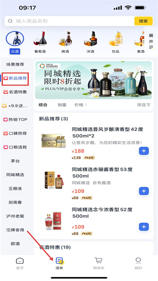 2、酒單白酒板塊,含新品推薦等場景,展示多款白酒,部分商品有PLUS會員優惠價。