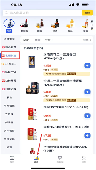 3、酒單白酒名酒特惠區,呈現汾酒、國窖等名酒,部分商品PLUS會員有隨機返現。