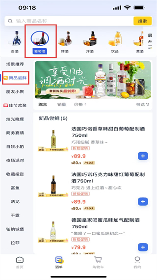 4、酒單葡萄酒板塊,有新品嘗鮮等場景,展示多款進口配制酒,有折扣促銷且部分商品承諾不好喝僅退款。