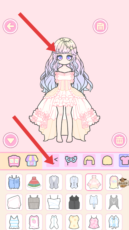 3、通過滑動下方的服飾類別欄,選擇不同類型的服裝點擊喜歡的服飾圖標,自由搭配出如洛麗塔風、休閑風等多樣風格的造型。