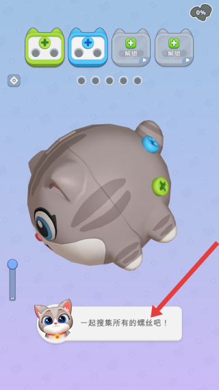 3、目標是一起搜集所有的螺絲,仔細尋找貓咪身上的螺絲,確保不遺漏,完成收集任務。