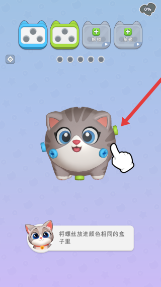 1、進入游戲,看到帶有不同顏色螺絲的貓咪,按照提示,將螺絲放進顏色相同的盒子里,開始收集螺絲的操作。