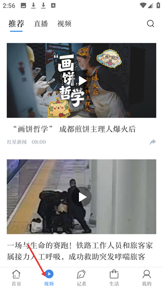 2、視頻板塊有推薦、直播等分類,展示畫餅哲學煎餅主理人、鐵路人員救助哮喘旅客等視頻,呈現社會熱點動態。