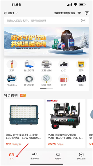 1、首頁有搜索欄、暖冬守護行動banner,展示工具、搬運存儲等分類入口,下方特價促銷鴕鳥工業款LED投光燈、MZB無油靜音空壓機等商品。