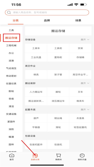 2、全部分類的分類頁,有工具、搬運存儲等眾多分類,搬運存儲下分存儲設備、高空作業等子分類,便于查找搬運相關工業用品。