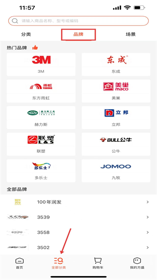 3、分類的品牌頁,有3M、東成、東方雨虹等熱門品牌,還有全部品牌列表,可按品牌篩選工業商品。