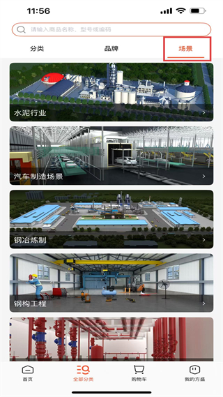 4、分類的場景頁,涵蓋水泥行業、汽車制造場景、鋼冶煉制等工業場景,便于用戶按場景選擇所需工業用品。