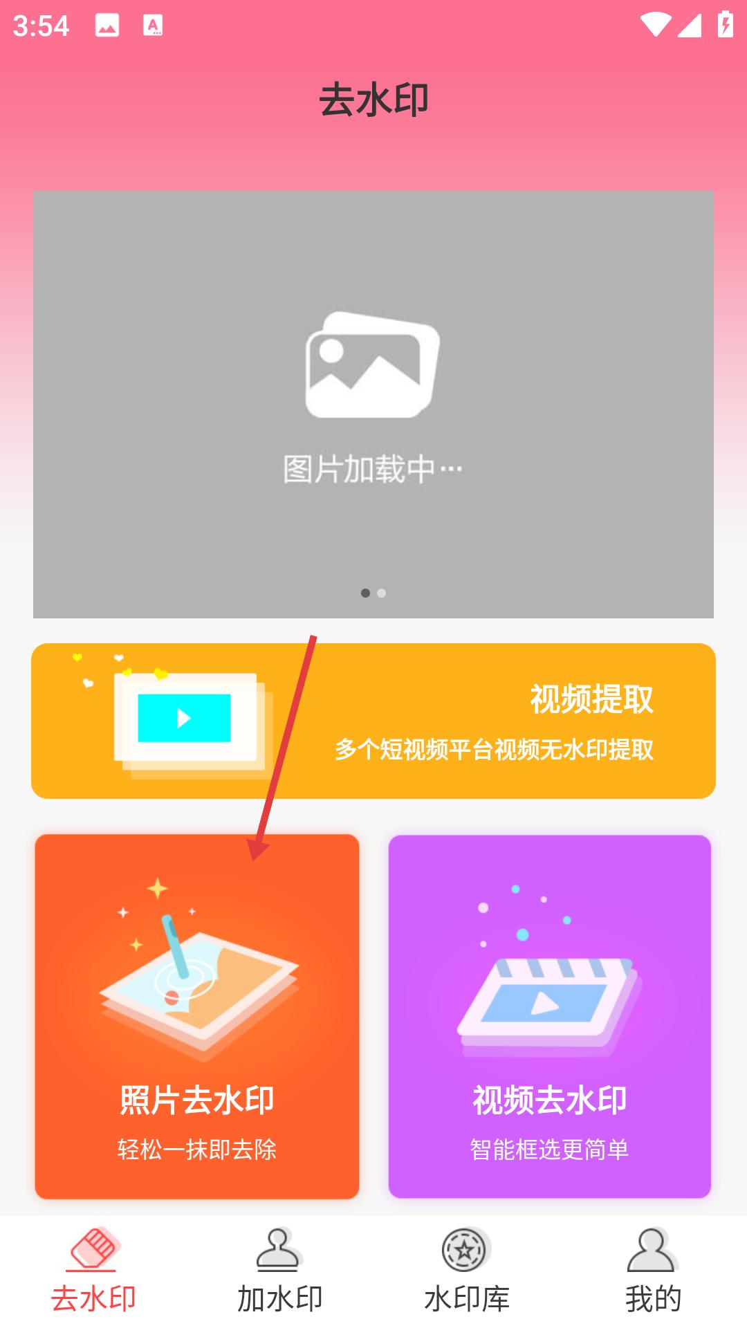 1、在去水印APP主界面,有照片去水印、視頻去水印等功能選項,照片去水印功能可輕松一抹去除圖片水印,滿足用戶去除圖片水印的需求。
