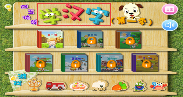1、四五快讀、學漢字主界面,課程分7冊呈現,僅第一冊可直接學習,其余需解鎖,底部互動游戲隨學習進度解鎖,適配幼小銜接識字需求。