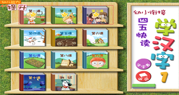 2、課程分課界面按課劃分內容,每冊含10課加測試,課程完成標星級,設生字表、返回功能,助力兒童循序漸進掌握漢字。