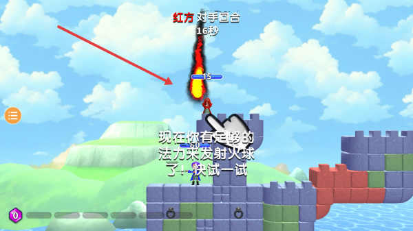 3、當法力值足夠時屏幕左下角的紫色法力條顯示法力情況,點擊相應按鈕釋放攻擊技能,比如發射火球攻擊敵方巫師。