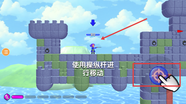 1、在游戲里使用屏幕右下角的操縱桿來控制己方巫師角色移動,在城堡場景中調整位置,尋找合適的攻擊角度。