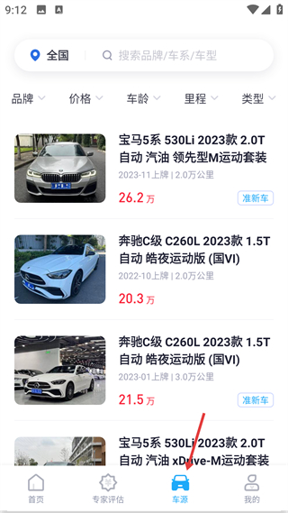 3、車源頁,展示全國二手車列表,含寶馬、奔馳等車型,支持品牌、價格等篩選,底部車源是二手車檢索入口。