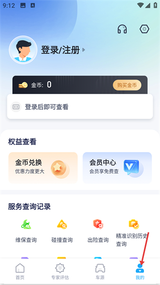4、我的頁,含登錄入口,可查看金幣、權益及服務查詢記錄,支持會員中心功能,底部我的是個人中心入口。